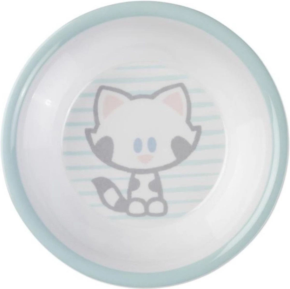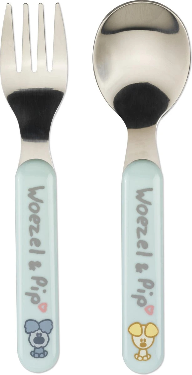De set bestaat uit een bord, kom, beker, vork en lepel. Elk deel van het servies is voorzien van een printje en afbeelding van Woezel, Pip of Buurpoes in zachte tinten. Het bestek is gemaakt van roestvrij staal met ABS handgrepen. Verpakt in een cadeaudoos met venster.