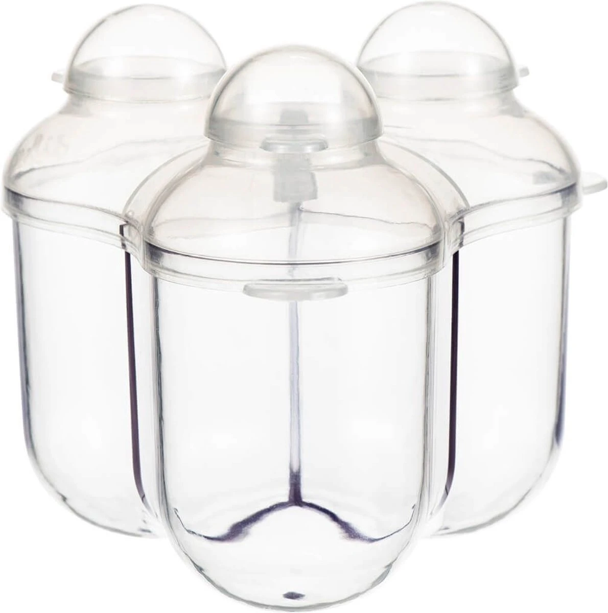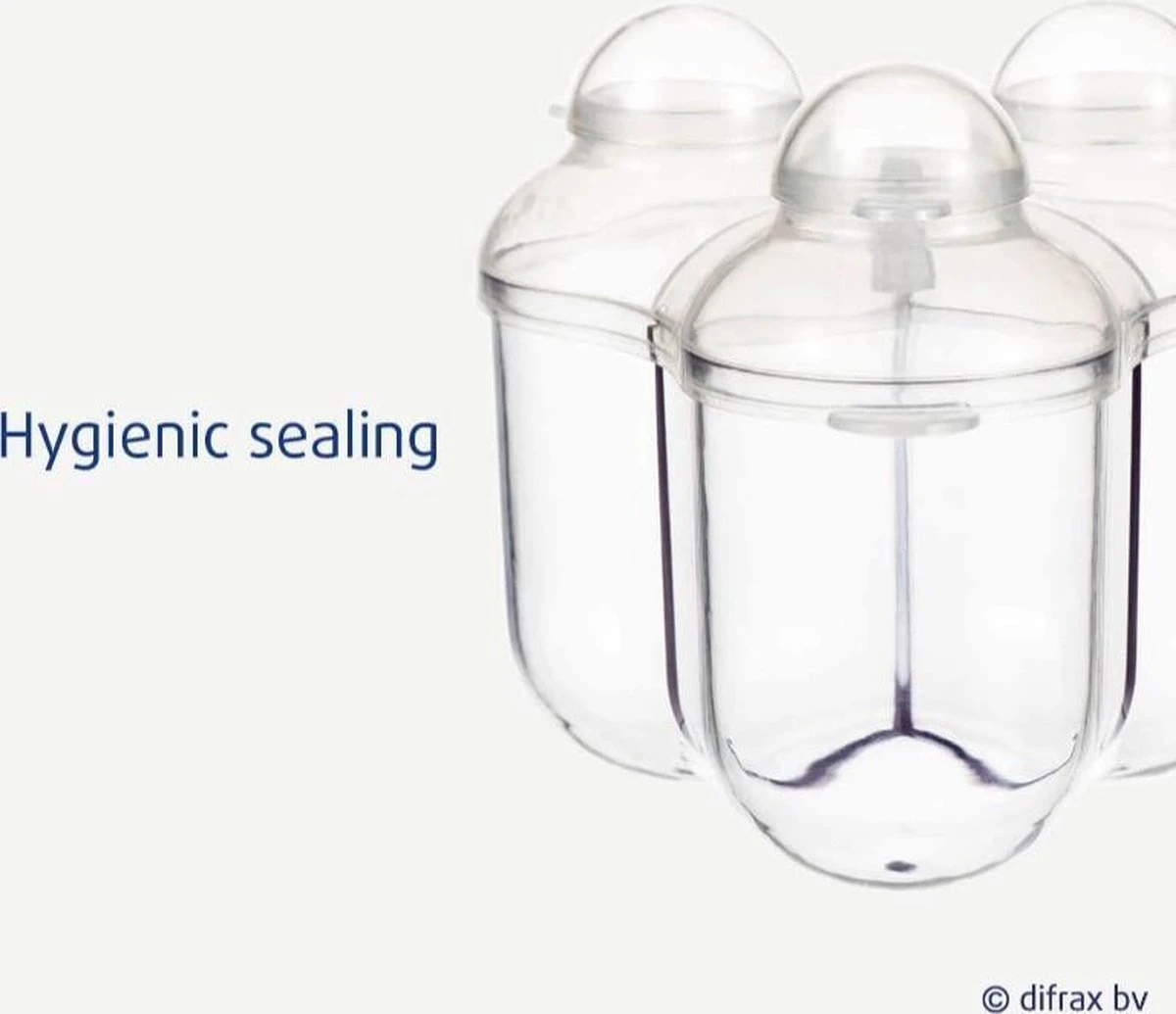 In het Difrax drievaks melkpoeder doosje kun je drie flesvoedingen hygiënisch meenemen, zoals melkpoeder of babyvoeding. Vul de S-fles of andere babyfles makkelijk onderweg. In elk vakje past een voeding van 210 ml (7 schepjes poedermelk).