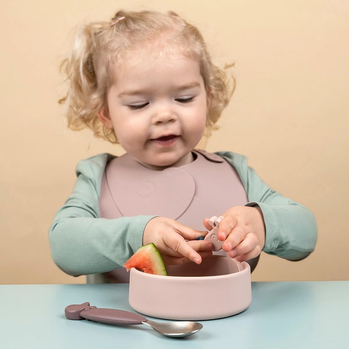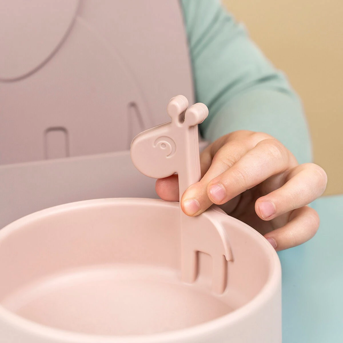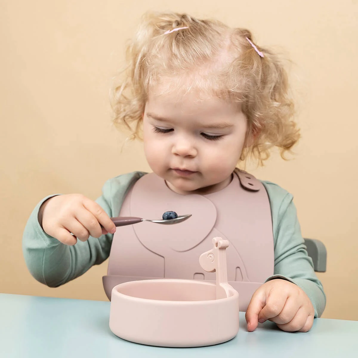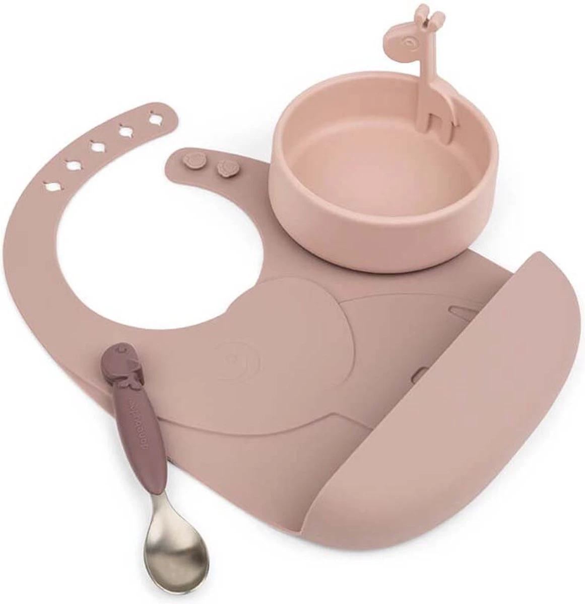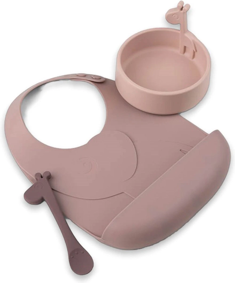 Met dit Done by Deer Peekaboo First Meal Set Deer Friends kan je kleintje zelfstandig eten. De set bestaat uit een bordje, een lepel en een slab met opvangbakje. De items hebben een leuk en herkenbaar ontwerp waardoor het voor je kindje leuk blijft om te eten. Het dinerset is gemaakt van siliconen en is vaatwasser en magnetron bestendig.