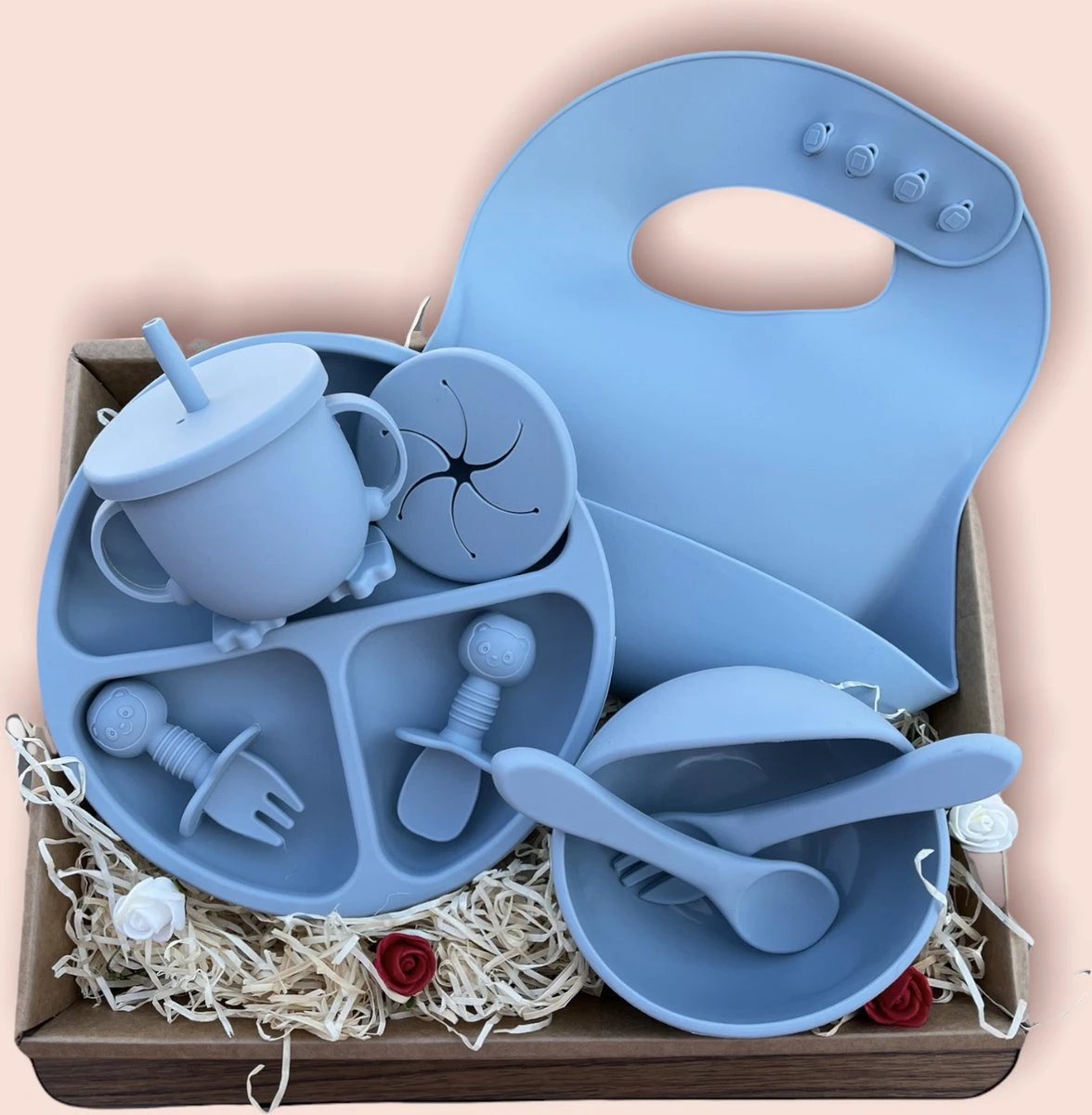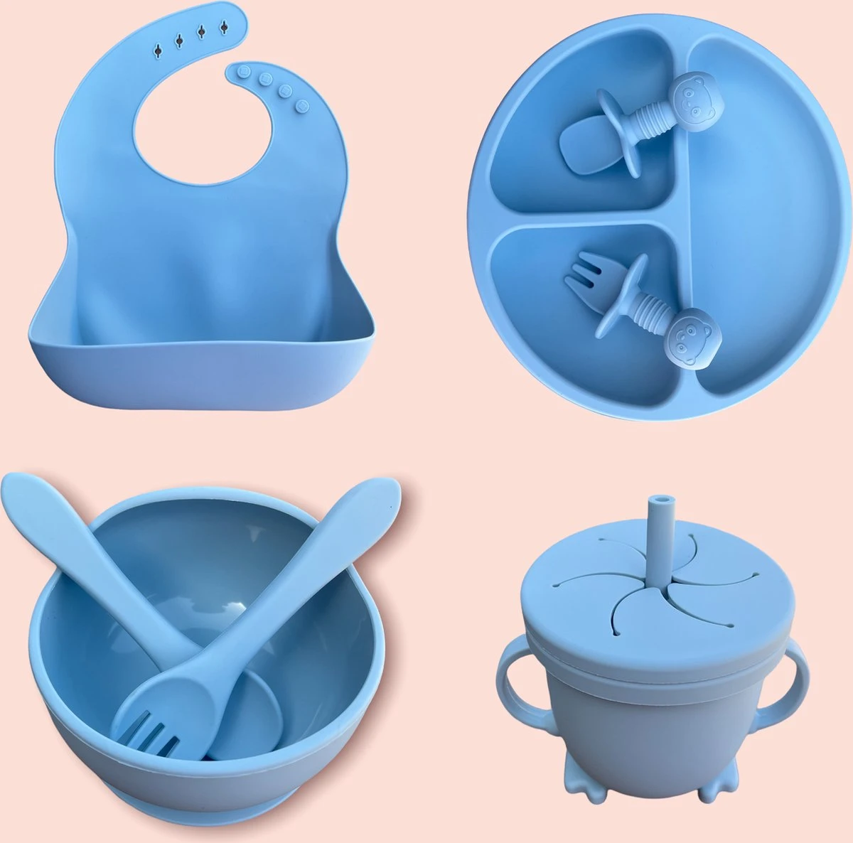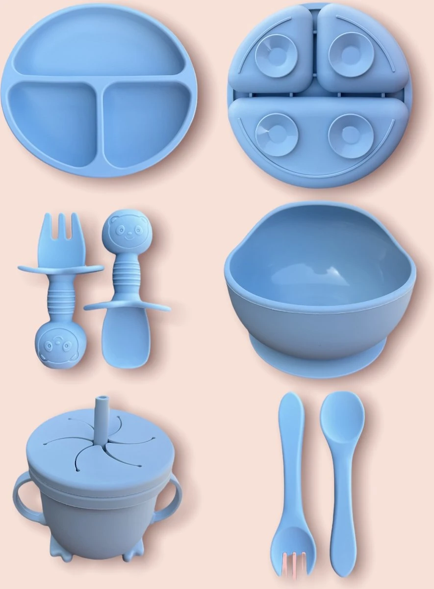 Het 9-delige siliconen kinderservies bestaat uit: